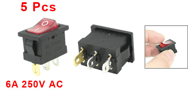 Product Name Rocker Switch Poles SPST Terminals 3 Pin (On - Off) Rating Voltage 6A 250V AC Light Voltage AC 220V Total Size(Each One) 20 x 15 x 29mm / 0.79" x 0.59" x 1.14"(L * W * T) Mount Hole Size 18 x 12.7mm / 0.7" x 0.5"(L*W) Light Color Red Color Black, Red Material Plastic & Metal Total Weight 22g Package Content 5 x Rocker Switch - Reviews