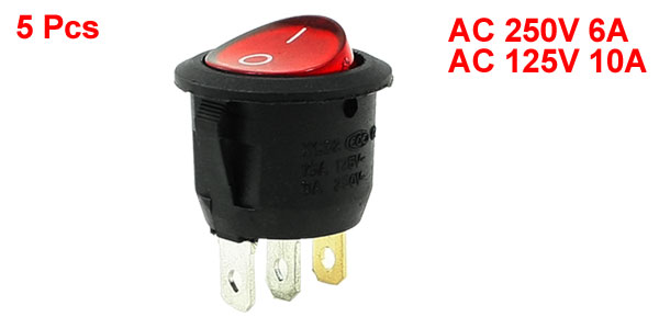 AC 6A/250V 10A/125VRed Light On/Off Snap in SPST Round Rocker Switch 5 Pieces