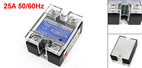 DetailsAC 80-250V to 24-480V Output Rectangle Shape Single Phase Solid State Relay 25 A  Product Name Solid State Relay Model No. BEM-14825AA Current & Frequency 25A, 50/60Hz Output Voltage 24-480VAC Control Voltage 80-250VAC Mounting Hole Diameter 4.5mm / 0.18" Total Size (Approx.) 58 x 45 x 32mm / 2.3" x 1.8" x 1.26" (L*W*T) Material Metal, Plastic, Electronic Parts Net Weight 116g Package Content 1 x Solid State Relay