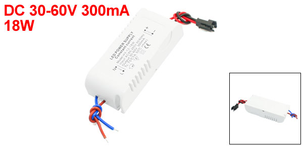 Product Name Waterproof LED Driver Fit for 18W LED Strip Input AC 85-265V 50/60Hz Output DC 30-60V 300mA Overall Size(Approx.) 9 x 6 x 2.3cm/3.5" x 2.4" x 0.9" (L*W*T) Shell Material Plastic Main Color White Net Weight 50g Package Content 1 x Waterproof LED Driver - Reviews