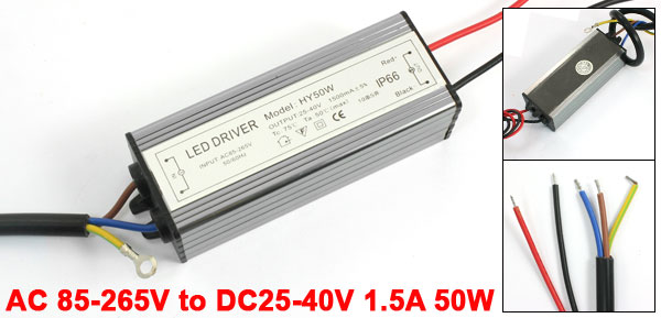 Product Name LED Driver Power Supply Model HY50W Design Waterproof Input AC 85-265V 50/60Hz Output DC25-40V 1500mA ± 5% Power 50W Tc 75°C Ta 50°C(max) Waterproof Level IP66 Body Size 109 x 36 x 28mm / 4.3" x 1.4" x 1.1" (L*W*T) Wire Length 43cm/ 16.9", 27cm/ 10.6" Main Material Aluminum Net Weight 218g Package Content 1 x LED Driver Power Supply - Reviews
