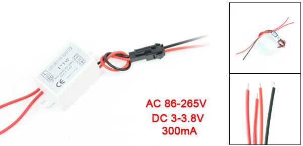 Product Name LED Driver Power Supply Input AC 85-265V 50/60Hz Output DC 3-3.8V/ 300mA Material Plastic, Electronic Parts Size 4 x 2.8 x 2cm / 1.6" x 1.1" x 0.78" (L*W*H) Main Color White Weight 17g Package Content 1 x LED Driver Power Supply - Reviews