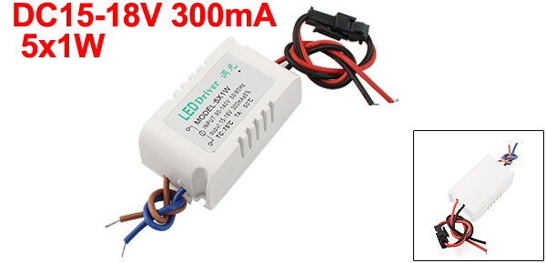 Product Name LED Driver Model 5 x 1W Input AC 90-140V 50/60Hz Output DC 15-18V 300mA Output Power 5 x 1W JST-HX Wire Length 22cm/8.7" Wire Length(Blue, Brown) 8cm/3.1" Overall Size(Approx.) 5.6 x 3.6 x 2.2cm/32.2'' x 1.5'' x 0.87'' (L*W*T) Shell Material Plastic Main Color White Net Weight 30g Package Content 1 x LED Driver - Reviews