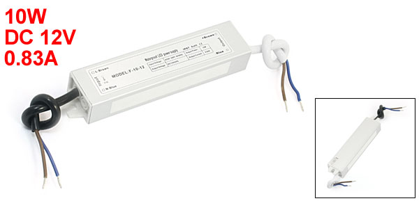 Product Name Waterproof LED Driver Fit for 10W LED Strip Input AC 90-260V 50/60HZ Output DC 12V 0.83A Protection Rank IP67 Overall Size(Approx.) 14 x 3 x 2cm/5.5" x 1.2" x 0.8(L*W*T) Cable Length 15cm/5.9" Shell Material Aluminum Alloy, Plastic Main Color Silver Tone Net Weight 140g Package Content 1 x Waterproof LED Driver - Reviews