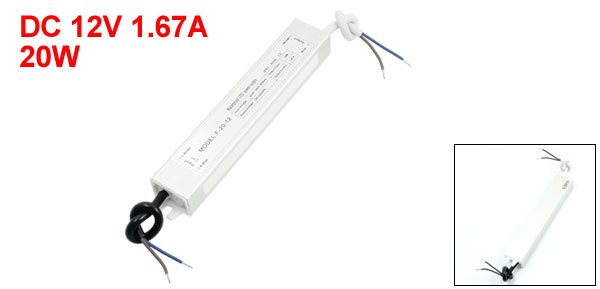 Product Name Waterproof LED Driver Fit for 20W LED Strip Input AC 90-260V 50/60HZ Output DC 12V 1.67A Protection Rank IP67 Overall Size(Approx.) 18 x 3 x 2cm/7.1" x 1.2" x 0.8" (L*W*T) Cable Length 15cm/5.9" Shell Material Aluminum Alloy, Plastic Main Color Silver Tone Net Weight 186g Package Content 1 x Waterproof LED Driver - Reviews