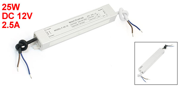 Product Name Waterproof LED Driver Fit for 25W LED Strip Input AC 90-260V 50/60HZ Output DC 12V 2.08A Protection Rank IP67 Overall Size(Approx.) 18 x 3 x 2cm/7.1" x 1.2" x 0.8" (L*W*T) Cable Length 15cm/5.9" Shell Material Aluminum Alloy, Plastic Main Color Silver Tone Net Weight 190g Package Content 1 x Waterproof LED Driver - Reviews