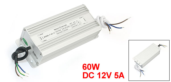 Product Name Waterproof LED Driver Fit for 60W LED Strip Input AC 90-260V 50/60HZ Output DC 12V 5A Protection Rank IP67 Overall Size(Approx.) 18 x 7 x 4.5cm/7.1" x 2.7" x 1.8" (L*W*T) Mounted Hole Center Distance 16.5 x 4cm/6.4" x 1.6"(L*W) Cable Length 15cm/5.9" Shell Material Aluminum Alloy, Plastic Main Color Silver Tone Net Weight 860g Package Content 1 x Waterproof LED Driver - Reviews