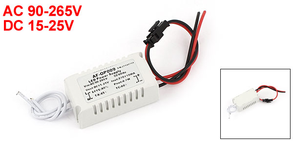 Product Name LED Driver Power Supply Input AC 90-265V, 50/60Hz Output DC 15-25V, 270±10MA Material Plastic Body Size 57 x 29 x 22mm/ 2.2" x 1.1" x 0.87"(L*W*H) Wire Length 22cm/8.3", 10cm/4" Main Color White Weight 22g Package Content 1 x LED Driver Power Supply - Reviews