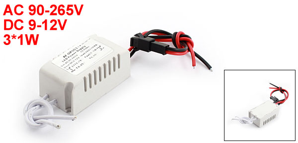 Product Name LED Driver Power Supply Model AF-OP003 Input AC 90-265V, 50/60Hz Output DC 9-12V Pout 3*1W Iout 280±10mA EFFE 78% TA 45°C TC 60°C Material Plastic Size 49 x 28 x 20mm/ 1.9" x 1.1" x 0.8"(L*W*H) Cable Length Long: 22cm/ 8.7"