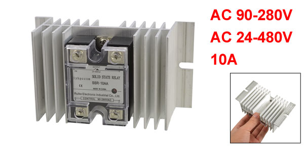 Product Name Solid State Relay + Heat Sink Model SSR-10AA Material Metal, Aluminum, Plastic Rated Load Current 10A Input AC 90-280V Output AC 24-480V Total Size (Approx.) 12.7 x 7 x 6cm / 5" x 2.7" x 2.3" (L * W * H) Heat Sink Color Silver Tone Weight 262g Package Content 1 x Solid State Relay