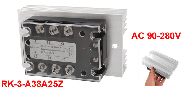 Product Name Solid State Relay Model No. RK-3-A38A25Z Control Voltage AC 90-280V,6-10mA Load Voltage AC 380V, 25A Size (Approx.) 15 x 9 x 7cm/ 5.9" x 3.5" x 2.8"(L*W*H) Main Color Silver Tone, Black, Clear Material Aluminum, Plastic, Metal Weight 665g Package Content 1 x Solid State Relay
