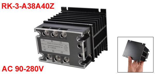 Product Name Solid State Relay Model No. RK-3-A38A40Z Control AC 90-280V, 6-10mA Load AC 380V, 40A Size (Approx.) 11 x 10 x 11.5cm/ 4.3" x 3.9" x 4.5"(L*W*H) Heat Sink Color Black Material Aluminum, Plastic, Metal Weight 766g Package Content 1 x Solid State Relay