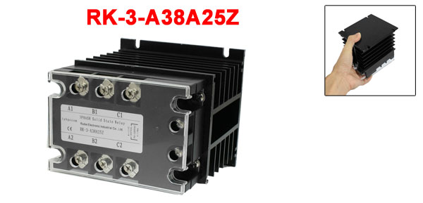 Product Name Solid State Relay Model No. RK-3-A38A25Z Control AC 90-280V Load AC 380V, 25A Size (Approx.) 10.5 x 10 x 12cm/ 4.1" x 3.9" x 4.7"(L*W*H) Color Black Material Aluminum, Plastic Weight 777g Package Content 1 x Solid State Relay