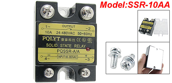 Product Name Solid State Relay Model No. SSR-10AA Input 80-380V AC Output 24-480V AC, 50-60Hz, 10A Size (Approx.) 4.4 x 5.7 x 3.1cm / 1.7" x 2.2" x 1.2" (L*W*T) Hole in Base Dia 0.44cm / 0.173" Color As Picture Shown Material Metal, Resin, Electric Parts Weight 107g Package Content 1 x Solid State Relay 2 x Fixed Screw - Reviews