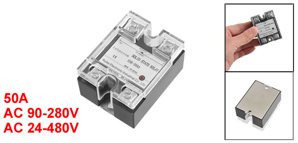 Product Name Solid State Relay Type SSR-50AA Material Plastic, Metal, Electric Parts Rated Load Current 50A Control Voltage AC 90-280V Output Voltage AC 24-480V Hole Dia 4.4mm/ 0.17" Total Size 5.8 x 4.5 x 3.2cm/ 2.3" x 1.8" x 1.3"(L*W*H) Main Color Black, Silver Tone, Clear Weight 92g Package Content 1 x Solid State Relay - Reviews