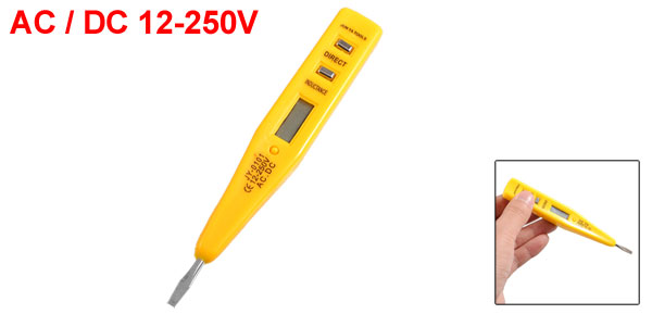 Product Name Digital Voltage Tester Material Plastic, Metal Voltage AC / DC 12-250V Tip Size (Approx.) 3mm Total Size (Approx.) 13.5 x 1.8 x 1.3cm / 5.3" x 0.7" x 0.5" (L * W * T) Handle Color Yellow Net Weight 19g Package Content 1 x Digital Voltage Tester - Reviews