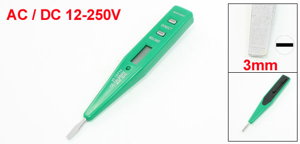 Product Name Digital Voltage Tester Material Plastic, Metal Voltage AC / DC 12-250V Tip Size (Approx.) 3mm / 0.12" Total Size (Approx.) 13.4 x 1.9 x 1.4cm / 5.2" x 0.75" x 0.55" (L * W * T ) Handle Color Green, Black Weight 29g Package Content 1 x Digital Voltage Tester - Reviews