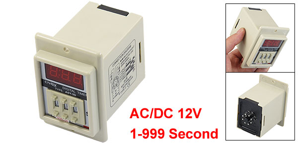Product Name Time Relay Type ASY-3D Control Voltage AC/DC 12V Frequency 50/60 Hz Contact AC 220V 5A Non-inductive Load Time Range 1-999 Second Mount Size (Approx.) 60 x 48 x 68mm/ 2.36" x 1.89" x 2.68" (L*W*Depth) Front Face Size 8.5 x 5.7cm / 3.3" x 2.2"(L*W) Mount Hole Diameter 4.5mm/ 0.18" Total Length 8.8cm / 3.5" Main Color Beige Net Weight 132g Package Content 1 x Digital Time Relay - Reviews