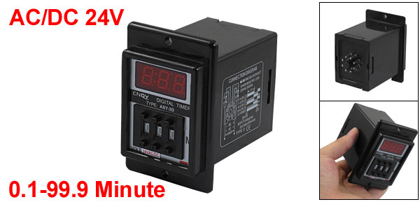 Product Name Time Relay Type ASY-3D Control Voltage AC/DC 24V Frequency 50/60 Hz Contact AC 220V 5A Non-inductive Load Time Range 0.1-99.9 Minute Mount Size (Approx.) 60 x 48 x 68mm/ 2.36" x 1.89" x 2.68" (L*W*Depth) Front Face Size 8.5 x 5.7cm / 3.3" x 2.2"(L*W) Mount Hole Diameter 4.5mm/ 0.18" Total Length 8.8cm / 3.5" Main Color Black Net Weight 133g Package Content 1 x Digital Time Relay - Reviews