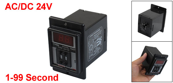 DetailsAC/DC 24V 1-99 Second Digital Timer Time Delay Relay 8 Pin ASY-2D  Product Name Time Relay Type ASY-2D Control Voltage AC/DC 24V Frequency 50/60 Hz Contact AC 220V 5A Non-inductive Load Time Range 1-99 Second Mount Size (Approx.) 60 x 48 x 68mm/ 2.36" x 1.89" x 2.68" (L*W*Depth) Front Face Size 8.5 x 5.7cm / 3.3" x 2.2"(L*W) Mount Hole Diameter 4.5mm/ 0.18" Total Length 8.8cm / 3.5" Main Color Black Net Weight 155g Package Content 1 x Digital Time Relay