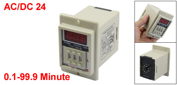 Product Name Time Relay Type ASY-3D Control Voltage AC/DC 24V Frequency 50/60 Hz Contact AC 220V 5A Non-inductive Load Time Range 0.1-99.9 Minute Mount Size (Approx.) 60 x 48 x 68mm/ 2.36" x 1.89" x 2.68" (L*W*Depth) Front Face Size 8.5 x 5.7cm / 3.3" x 2.2"(L*W) Mount Hole Diameter 4.5mm/ 0.18" Total Length 8.8cm / 3.5" Main Color Beige Net Weight 134g Package Content 1 x Digital Time Relay - Reviews