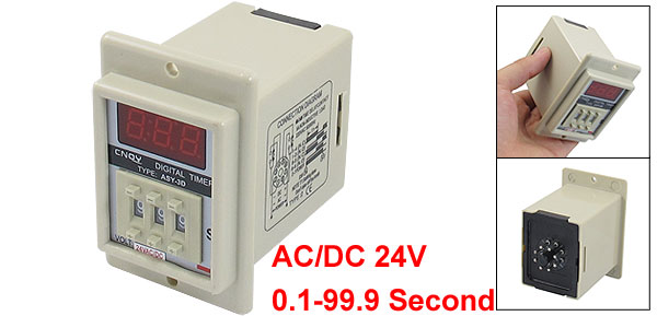 Product Name Time Relay Type ASY-3D Control Voltage AC/DC 24V Frequency 50/60 Hz Contact AC 220V 5A Non-inductive Load Time Range 0.1-99.9 Second Mount Size (Approx.) 60 x 48 x 68mm/ 2.36" x 1.89" x 2.68" (L*W*Depth) Front Face Size 8.5 x 5.7cm / 3.3" x 2.2"(L*W) Mount Hole Diameter 4.5mm/ 0.18" Total Length 8.8cm / 3.5" Main Color Beige Net Weight 134g Package Content 1 x Digital Time Relay - Reviews