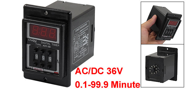 Product Name Time Relay Type ASY-3D Control Voltage AC/DC 36V Frequency 50/60 Hz Contact AC 220V 5A Non-inductive Load Time Range 0.1-99.9 Minute Mount Size (Approx.) 60 x 48 x 68mm/ 2.36" x 1.89" x 2.68" (L*W*Depth) Front Face Size 8.5 x 5.7cm / 3.3" x 2.2"(L*W) Mount Hole Diameter 4.5mm/ 0.18" Total Length 8.8cm / 3.5" Main Color Black Net Weight 134g Package Content 1 x Digital Time Relay - Reviews