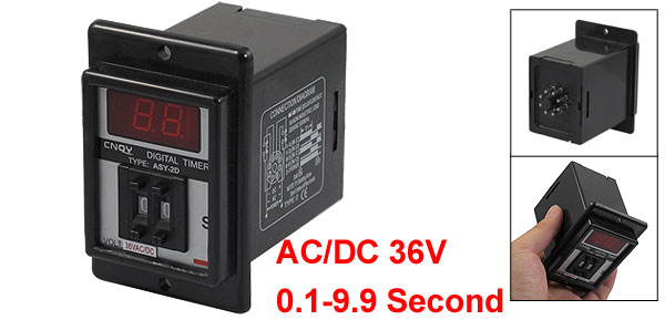 Product Name Time Relay Type ASY-2D Control Voltage AC/DC 36V Frequency 50/60 Hz Contact AC 220V 5A Non-inductive Load Time Range 0.1-9.9 Second Mount Size (Approx.) 60 x 48 x 68mm/ 2.36" x 1.89" x 2.68" (L*W*Depth) Front Face Size 8.5 x 5.7cm / 3.3" x 2.2"(L*W) Mount Hole Diameter 4.5mm/ 0.18" Total Length 8.8cm / 3.5" Main Color Black Net Weight 130g Package Content 1 x Digital Time Relay - Reviews