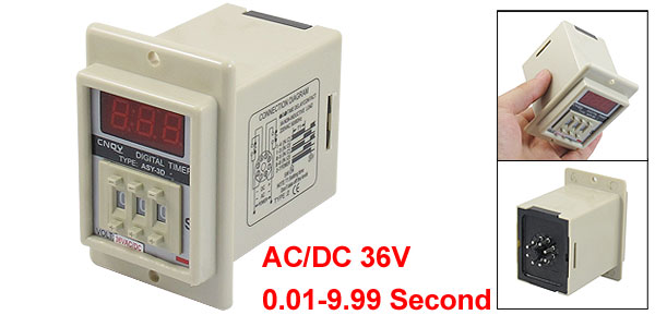 Product Name Time Relay Type ASY-3D Control Voltage AC/DC 36V Frequency 50/60 Hz Contact AC 220V 5A Non-inductive Load Time Range 0.01-9.99 Second Mount Size (Approx.) 60 x 48 x 68mm/ 2.36" x 1.89" x 2.68" (L*W*Depth) Front Face Size 8.5 x 5.7cm / 3.3" x 2.2"(L*W) Mount Hole Diameter 4.5mm/ 0.18" Total Length 8.8cm / 3.5" Main Color Beige Net Weight 133g Package Content 1 x Digital Time Relay - Reviews