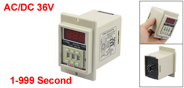 Product Name Time Relay Type ASY-3D Control Voltage AC/DC 36V Frequency 50/60 Hz Contact AC 220V 5A Non-inductive Load Time Range 1-999 Second Mount Size (Approx.) 60 x 48 x 68mm/ 2.36" x 1.89" x 2.68" (L*W*Depth) Front Face Size 8.5 x 5.7cm / 3.3" x 2.2"(L*W) Mount Hole Diameter 4.5mm/ 0.18" Total Length 8.8cm / 3.5" Main Color Beige Net Weight 134g Package Content 1 x Digital Time Relay - Reviews