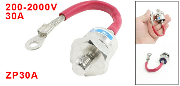 Product Name Rectifier Diode Model ZP30A Average Forward Current 30A Repetitive Peak Reverse Voltage(VRRM) 200-2000V Male Thread Diameter 12mm / 0.47" Wire Length 10cm/ 3.9" Main Body Size 27 x 27mm / 1" x 1"(L*W) Overall Long 18cm/ 7" Color Silver Tone Material Metal Net Weight 87g Package Content 1 x Rectifier Diode - Reviews