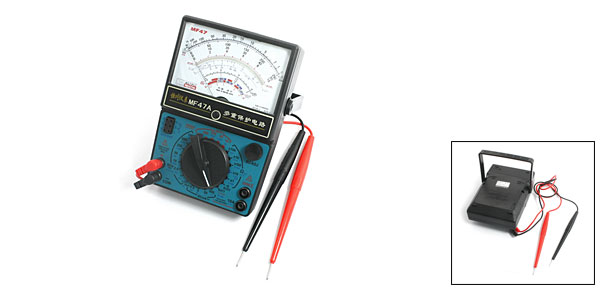 10A, 5%DC Voltage(Sensitivity/ Accuracy) 0.25V/1V/2.5V/10V/50V/250V/500V/1000V/2500V, 20kOhm, 2.5% AC Voltage(Sensitivity/ Accuracy) 10V/50V/250V/500V/1000V/2500V, 9kOhm, 5% DC Resistance Rx1/Rx10/Rx100/Rx1k/Rx10k, Center Value 16.5, 10% Power By 1 x 1.5V R14 /9V 6F22 Battery not included Meter Size 165 x 113 x 46mm/ 6.5" x 4.4" x 1.8"(L*W*T) Mateiral Plastic, Electronic Parts Main Color Black, White, Blue Total Weight 463g Package Content 1 x Pointer Multimeter
