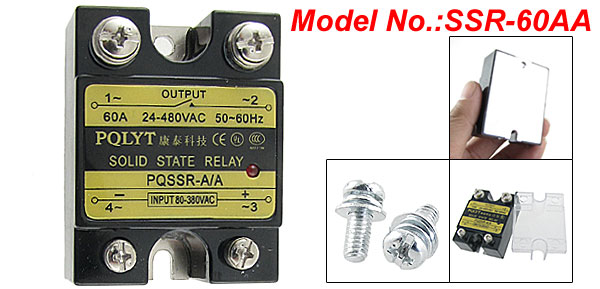 Product Name Solid State Relay Model No. SSR-60AA Input 80-380V AC Output 24-480V AC, 50-60Hz, 60A Size (Approx.) 4.4 x 5.7 x 3.1cm / 1.7" x 2.2" x 1.2" (L*W*T) Hole in Base Dia 0.44cm / 0.173" Color As Picture Shown Material Metal, Resin, Electric Parts Weight 108g Package Content 1 x Solid State Relay