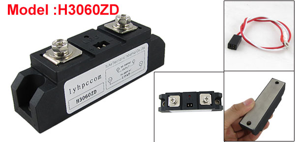 Product Name Solid State Relay Model No. H3060ZD Control Method AC to AC Current 60A Input Voltage 90-280V AC Output Voltage 75-480V AC Relay Size (Approx.) 9.3 x 2.5 x 3cm / 3.7" x 0.98" x 1.2" (L*W*H ) Wire Length 23.5cm / 9.3" Material Metal, Plastic Main Color Black Weight 129g Package Content 1 x Solid State Relay 1 x Plug Wire - Reviews