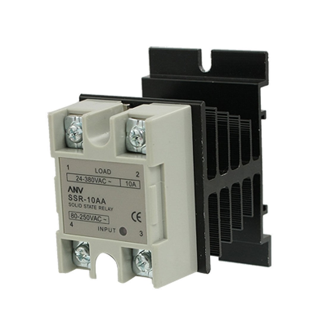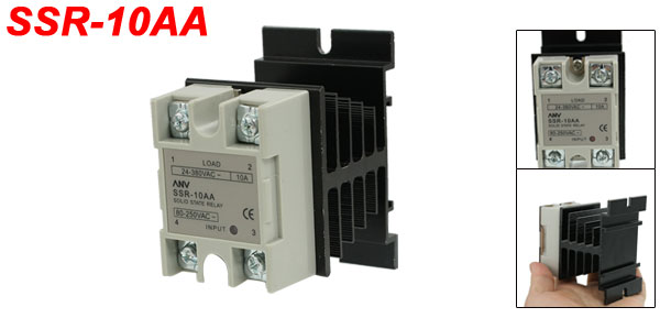 Product Name Solid State Relay w Heat Sink Type SSR-10AA Material Relay: Metal, Plastic, Electric Parts Heat Sink: Aluminum Rated Load Current 10A Input AC 80-250V Output AC 24-380V Relay Size 5.7 x 4.4 x 2.5cm / 2.2" x 1.7" x 1" (L*W*T) Heat Sink Size 8.1 x 5 x 5cm/ 3.1" x 2" x 2"(L*W*H) Total Size 8.1 x 5 x 7.6cm/ 3.1" x 2" x 3"(L*W*H) Main Color Black, Gray Weight 200g Package Content 1 x Solid State Relay