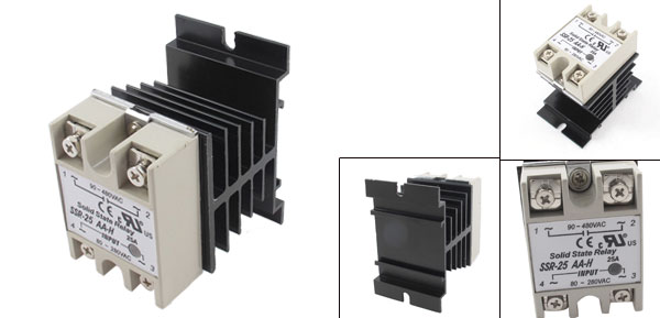 Product Name Heat Sink Solid State Relay Type SSR-25AA-h Material Relay: Metal, Plastic, Electric Parts Heat Sink: Aluminum Rated Load Current 25A Input AC 80-280V Output AC 90--480V Relay Size 6 x 4.5 x 2.2cm / 2.3" x 1.7" x 0.8" (L*W*H) Heat Sink Size 8.1 x 5 x 4.2cm/ 3.1" x 2" x 1.6"(L*W*H) Total Size 8.1 x 5 x 7.2cm/ 3.1" x 2" x 2.8"(L*W*H) Main Color Black, Gray Weight 209g Package Content 1 x Heat Sink Solid State Relay - Reviews