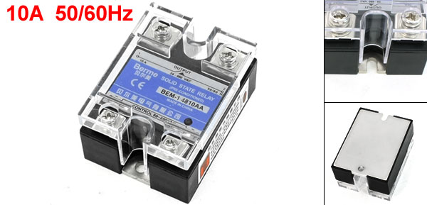 Product Name Solid State Relay Model No. BEM-14810AA Current & Frequency 10A, 50/60Hz Output Voltage 24-480VAC Control Voltage 80-250VAC Mounting Hole Diameter 4.5mm / 0.18" Total Size (Approx.) 58 x 45 x 32mm / 2.3" x 1.8" x 1.26" (L*W*T) Material Metal, Plastic, Electronic Parts Net Weight 116g Package Content 1 x Solid State Relay - Reviews