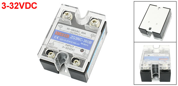 Product Name Solid State Relay Model No. ZG3NC-360B Current & Frequency 60A, 50/60Hz Output Voltage 90-480VAC Input Voltage 3-32VDC Mounting Hole Size 6 x 4.8mm / 0.24" x 0.19"(L*W) Total Size (Approx.) 58 x 45 x 32mm / 2.3" x 1.8" x 1.26" (L*W*T) Material Metal, Plastic, Electronic Parts Weight 106g Package Content 1 x Solid State Relay - Reviews