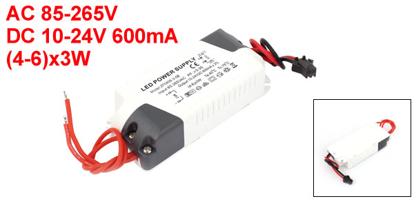 Main Color White,Gray,Black,Red Input AC 85-265V Net Weight 53g Country of Manufacture CHINA Package Content 1 x LED Drive Power Supply JST-HX Wire Length 12cm/5" Material Plastic Output Power (4-6)x3W Output DC 10-24V 600mA Wire Length(Red) 12cm/5" Body Size 9 x 3.8x 2.2cm/3.5" x 1.5" x 0.87"(L*W*H) - Reviews