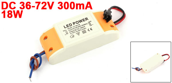 Product Name Waterproof LED Driver Model 12-18X1W Fit for 18W LED Strip Input AC 100-250V 50/60Hz Output DC 36-72V 300mA Tc 75C TA(max) 50C Overall Size(Approx.) 9 x 4 x 2.2cm/3.5" x 1.6" x 0.87" (L*W*T) Shell Material Plastic Main Color Beige, Orange Net Weight 48g Package Content 1 x Waterproof LED Driver - Reviews