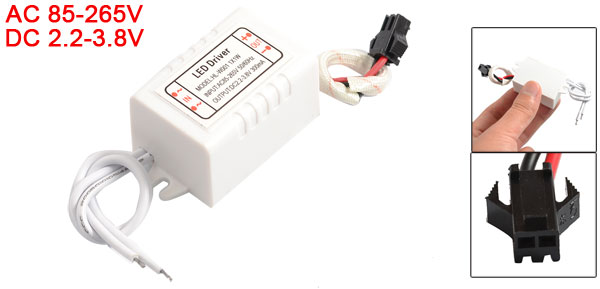 DetailsAC110-220V 2.2-3.8V 300mA 1x1W LED Strip Light Power Supply Transformer Driver  Product Name (1x1W) LED Power Supply Driver Input AC 85-265V 50/60Hz Output DC 2.2-3.8V 300mA External Material Plastic Size 4 x 2.7 x 2.2cm / 1.6" x 1.06" x 0.86" (L*W*H) Total Length 24cm/ 9.4" Main Color White Weight 16g Package Content 1 x (1x1W) LED Power Supply Driver