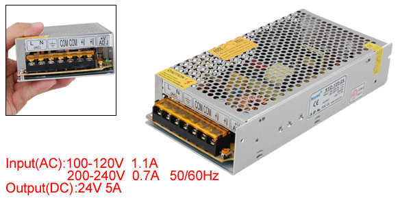 Product Name Switching Power Supply Input(AC) 100-120V 1.1A 200-240V 0.7A 50/60Hz Output(DC) 24V 5A Material Metal, Electronic Parts Size(Approx) 19.8 x 9.8 x 4.1cm/ 7.8" x 3.8" x 1.6"(L*W*T) Color Siver Tone Weight 530g Package Content 1 x 24V 5A Switching Power Supply - Reviews
