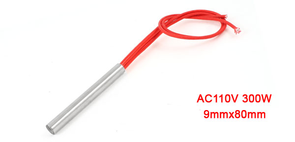 DetailsAC110V 300W Mold Heating Stainless Steel Cartridge Heater 9mmx80mm  Product Name Cartridge Heater Material Stainless Steel, PVC Rated Voltage AC 110V Power 300W Heater Size (Approx.) 9 x 80mm / 0.3" x 3.1" (D*L ) Wire Length (Approx.) 29cm / 11.4" Color Silver Tone, Red Weight 33g Package Content 1 x Cartridge Heater