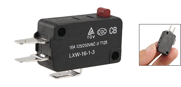 Product Name Micro Switch Model No. LXW-16-13 Actuator Type Button Rating AC125/250V, 16A Contact configuration SPDT Switch Body Size(Approx) 2.8 x 1.6 x 1cm / 1.1" x 0.63" x 0.39"(L*W*H) Fixing Holes Dia(Approx) 0.29cm / 0.11“ Terminals Width(Approx) 0.47cm / 0.19" Dia of Holes in Terminals(Approx) 0.14cm / 0.055" Button Height(Approx) 0.2cm / 0.08" Material Plastic & Metal Color Black, Silver Tone Net Weight 8g Package Content 1 x Micro Switch - Reviews