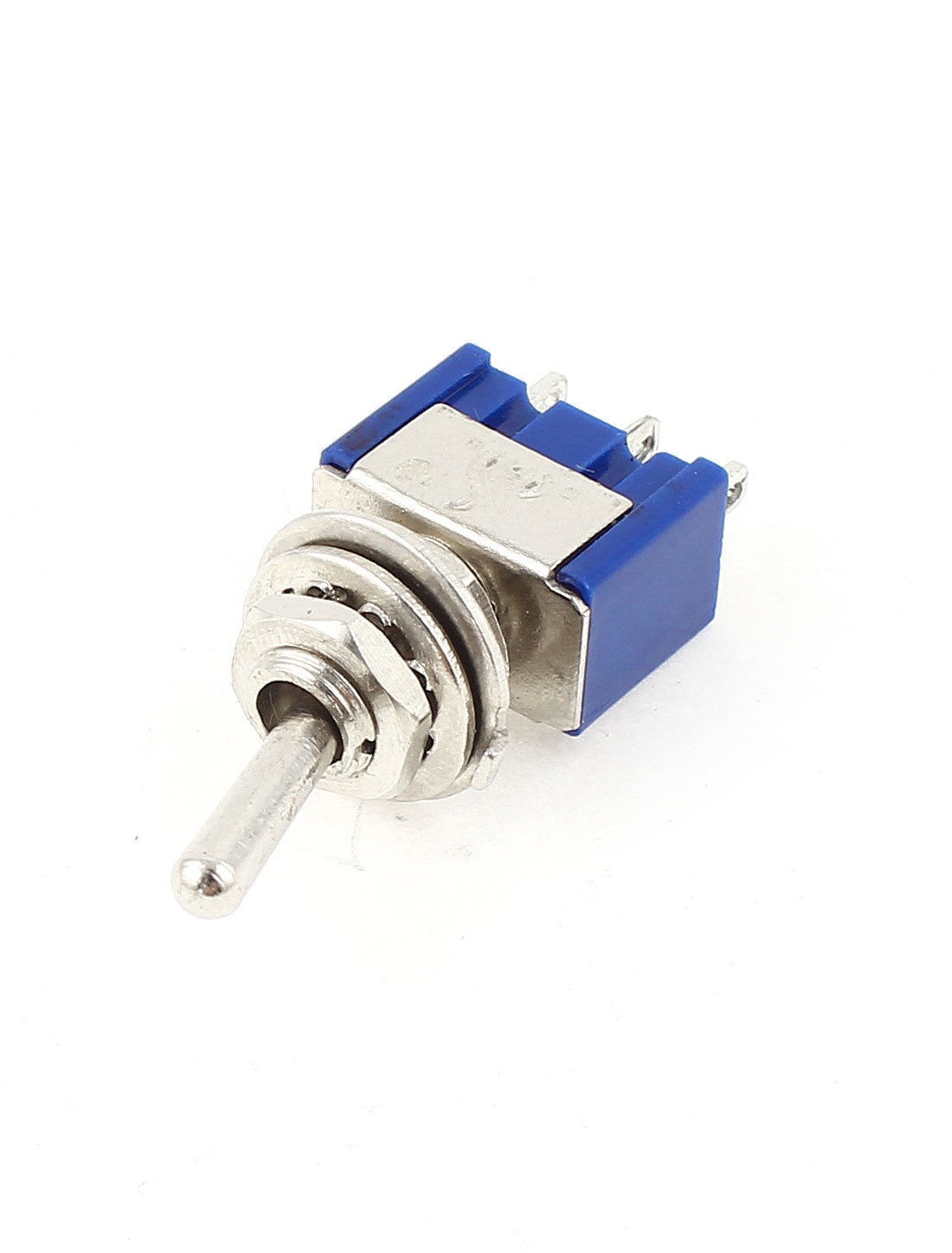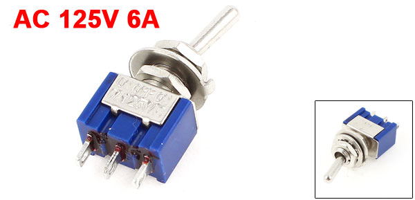DetailsAC125V 6A 3 Pin 2-Position SPDT On/On Self Locking Miniature Toggle Switch  Product Name Toggle Switch Type SPDT(Latching) Position 2(On/On) Thread Diameter 6mm / 0.24" Voltage & Current AC 125V 6A Main Body Size 13 x 10mm / 0.5" x 0.4"(L*W) Overall Height 33mm / 1.3" Material Metal, Plastic Color Blue, Silver Tone Weight 6g Package Content 1 x Toggle Switch