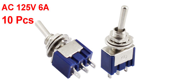 Product Name Toggle Switch Type SPDT Latching ON-OFF-ON Position 3 Voltage & Current AC 125V 6A Total Size 13 x 11 x 33mm/0.51" x 0.43" x 1.3"(L*W*H) Mounting Thread 5.8mm/0.23" Material Metal, Plastic Main Color Blue, Silver Tone Weight 49g Package Content 10Pcs x Toggle Switches - Reviews