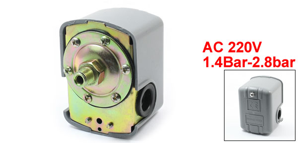 Product Name Pressure Switch for Self Priming Pump Rating AC 220V Power 2HP(1.5KW) Terminal Number 4 Male Thread Diameter 13mm/0.51" Male Thread Length 12mm/0.47" Pressure Range 0.14-0.28mPa/1.4Bar-2.8bar Body Size 9.7 x 6.8 x 6.7cm/3.8" x 2.7" x 2.6"(L*W*H) Main Color Gray, Gold Tone Material Plastic, Metal Weight 331g Package Content 1 x Pressure Switch - Reviews