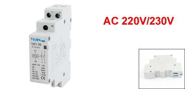 Product Name AC Contactor Model No. YJC1-25 Rated Coil Voltage AC 220V/230V Ie(AC-7a) 25A Rated Voltage(Ue) AC 230V Insulation Voltage(Ui) 500V AC-7a 5KW AC-7b 1.4KW Contact Type 2NO Number of Poles 2 Mounting Type 35mm DIN Rail Overall Size(Approx.) 82 x 65 x 18mm / 3.2" x 2.6" x 0.7"(L*W*T) Material Plastic, Electronic Parts Net Weight 119g Package Content 1 x AC Contactor - Reviews