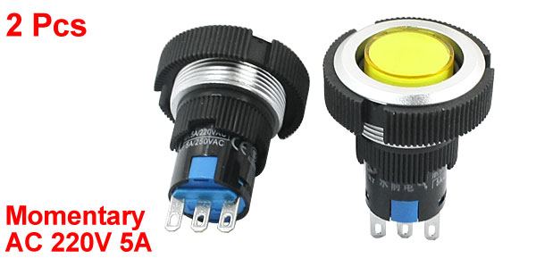 Item Name Push Button Switch Action Type Momentary Type Contact SPDT(1NO 1NC) Ith 5A Switch Rating AC 220V 5A Pin Number 3 Button Dia 15mm/0.6" Thread Diameter 22mm/0.87'' Total Size(Not Included Pin) 29 x 32mm/1.2'' x 1.3'' (L*Max.W) Material Plastic, Electric Parts Housing Color Black, Yellow Net Weight 23g Package Content 2 Pcs x Push Button Switch - Reviews