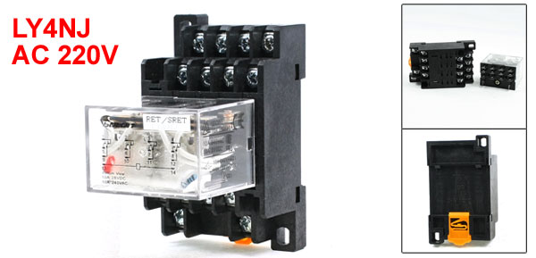 Product Name Electromagnetic Relay Model No. LY4NJ Coil Voltage AC 220V Contact Capacity 10A 240VAC/28VDC Type 4PDT Number of Terminals 14 Mount Rail Type 35mm DIN Rail Fixing Mount Hole Size 6 x 4mm/0.24" x 0.16"(L*W) Total Size (Approx.) 75 x 45 x 65mm/2.7" x 1.3" x 2.6"(L*W*H) Shell Material Plastic Main Color Black, Clear Blue Net Weight 139g Package Content 1 x Electromagnetic Relay - Reviews